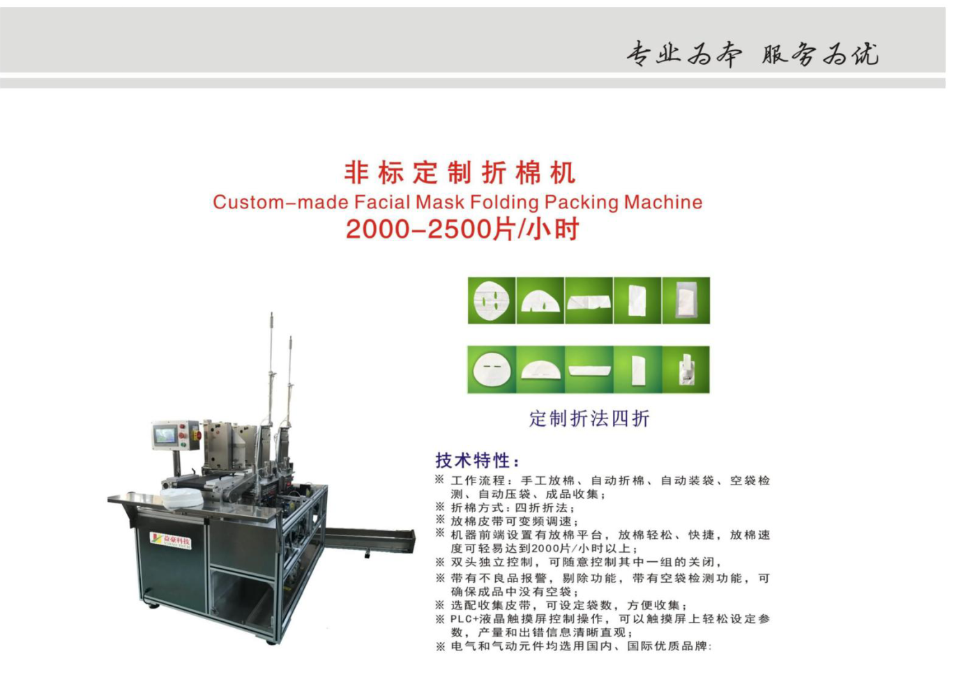 1、工作流程:手工放棉、自動折棉、自動裝袋,自動壓袋、無棉不折疊,無袋不裝袋,出錯自動報(bào)警,空袋檢測;