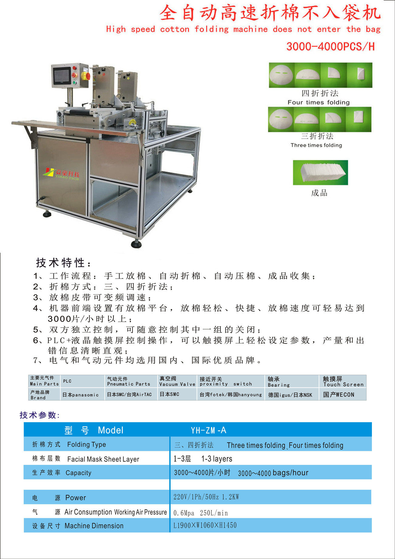 1、工作流程:手工放棉、自動折棉、自動壓棉、成品收集;